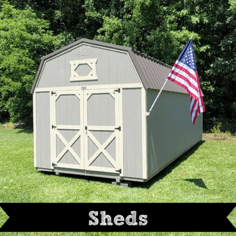 The Sheds page includes Price Sheets, Shed Display Pricing Signage, U-Loft Pricing, Window Layout Guide, Custom Color and Paint & Stain Info, Engineered Stamped Drawings, and 150 MPH Plans, and a review of Sheds versus Tiny Homes.